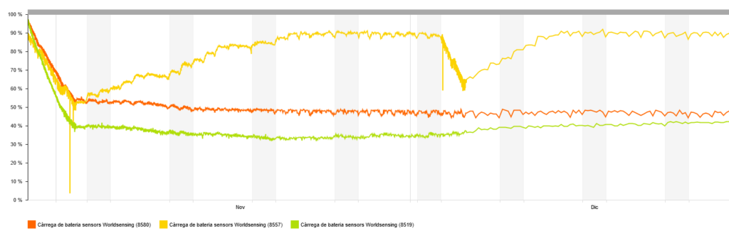 La monitorización del estado de la batería ha demostrado la disponibilidad a largo plazo de los nodos, incluso cuando se requiere una tasa de muestreo de datos alta (tan frecuente como 1 por minuto). Con nodos en tasas de muestreo normales (de cada 15 minutos a cada 1 hora), las baterías se recargan sin problemas. Esto representa una mejora muy significativa en la vida útil de la batería del sistema: las baterías ahora se recargan continuamente, proporcionando operación ilimitada del nodo IoT Loadsensing.