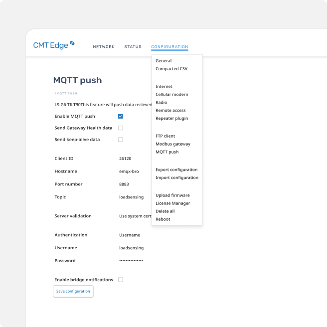 Integre fácilmente los datos recopilados con software de terceros. Cuando la función de gestión dual está activada en CMT Cloud, las instancias de CMT Edge pueden ser visibles desde la nube para disponer de funciones avanzadas de procesamiento de datos.