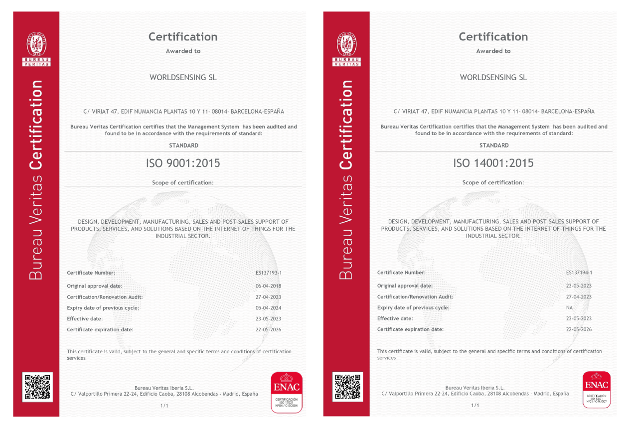 Worldsensing has held ISO 9001 for quality since 2018 and ISO 14001 for environmental management since 2023. These certifications complement our ISO 27001 for information security, which we have held since 2018, rounding out a robust management system framework that underpins every aspect of our operations.